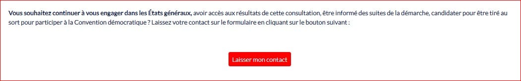 Si vous avez répondu au questionnaire en tant que « citoyen », vous pourrez participer au tirage au sort qui déterminera les participants à la Convention démocratique qui débattra des solutions à prioriser à la suite de la consultation en ligne. Il vous suffira de laisser vos coordonnées via le bouton « Laisser mon contact ».