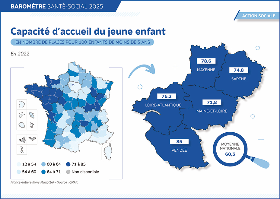 A l’instar du Grand Ouest, la région Pays de la Loire est l’une des régions les mieux dotées en capacité d’accueil du jeune enfant avec plus de 77,28 places pour 100 enfants de moins de 3 ans en 2022 contre 60,3 places en moyenne en France (1).