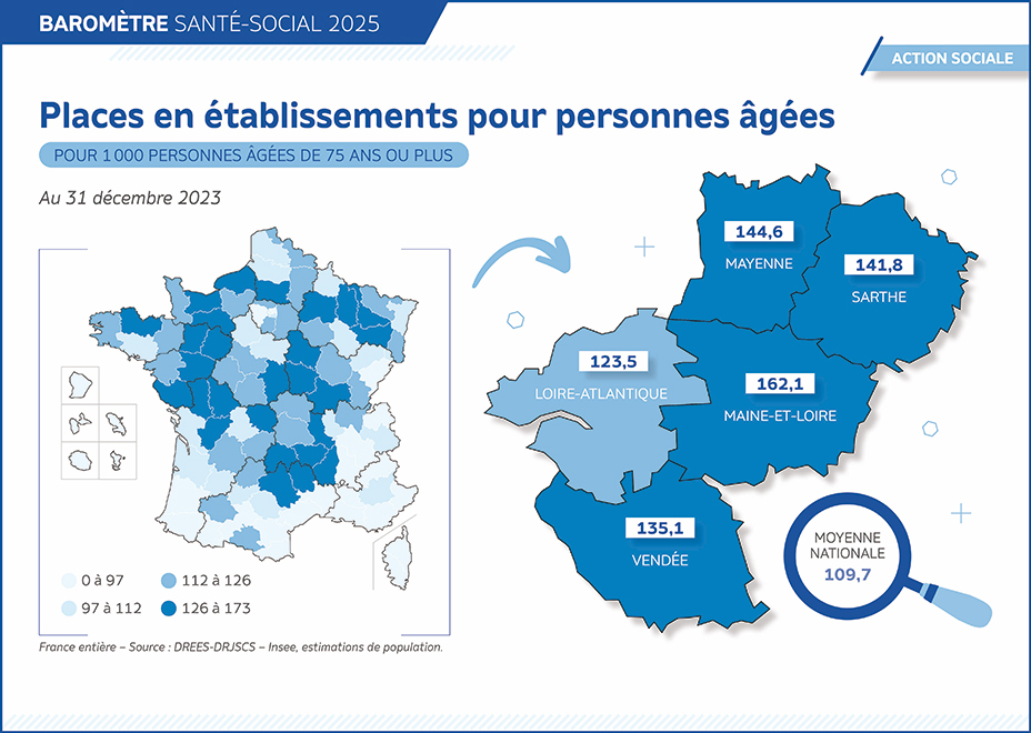 Comme en 2021, le Maine-et-Loire conserve sa position de tête de la région en 2023 avec 162.1 places disponibles pour 1 000 personnes âgées.