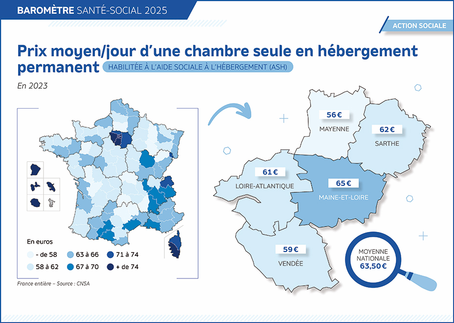Pour la chambre habilitée ASH, 4 départements ligériens sur 5 affichent des prix inférieurs à la moyenne nationale. Seul le Maine-et-Loire se situe au-dessus de la moyenne nationale avec un prix de 65 euros.