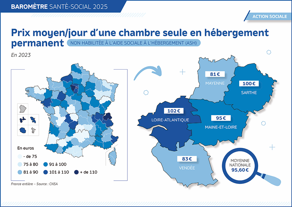 Pour le prix de la chambre non habilitée ASH, l’offre régionale est au-dessus du prix national en Loire-Atlantique et en Sarthe. La Vendée et la Mayenne font exception avec respectivement 12.6 euros et 14.60 euros de moins par jour comparativement à la moyenne nationale.