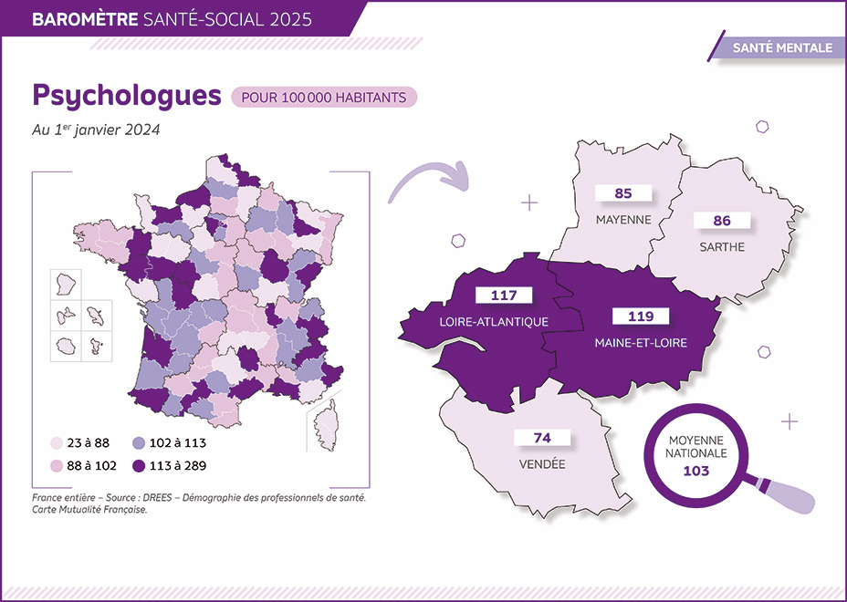96,2 psychologues pour 100 000 habitants en Pays de la Loire (103 en France)